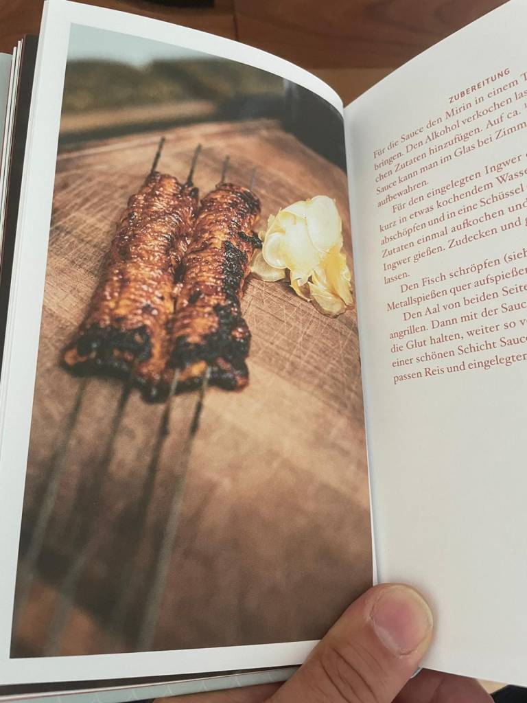 Den Aal von beiden Seiten über Holzkohle stark angrillen. Dann mit der Sauce bepinseln und kurz auf die Glut halten, weiter so verfahren, bis der Aal mit einer schönen Schicht Sauce überzogen ist. Gut dazu passen Reis und eingelegter Ingwer.