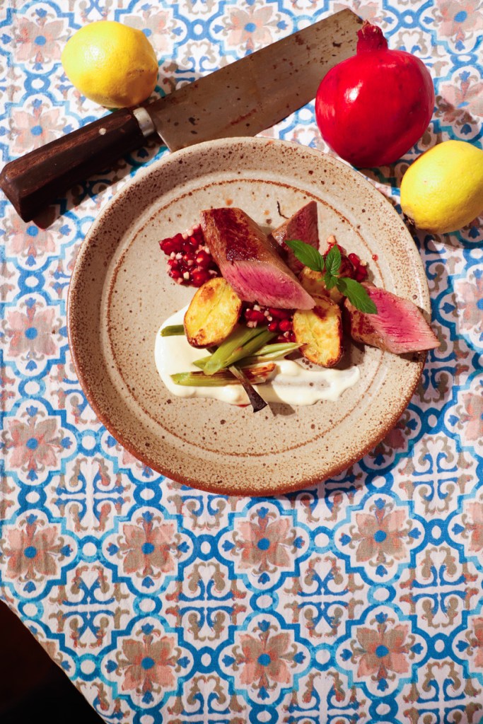 Aber zuerst zum Rehrücken: Eigentlich sollte man als Jäger die Kühltruhe voller feinster Wildspezialitäten haben. Eigentlich. Doch durch das Leben an sich, wenig Zeit und waidmännisches Pech klafft dort, wo eigentlich der ein oder andere Rehrücken liegen sollte ein großes Loch in meiner Vorratshaltung. Ihr könnt erahnen, wie schmerzhaft die bloße Erwähnung des Wortes „eigentlich“ in diesem Zusammenhang für mich ist. Doch eigentlich ist das auch kein Problem, wenn man sich zu helfen weiß. Kurzerhand disponierte ich auf Lammrücken in der Hauptrolle des Gerichtes um und ließ die mit einem lauten Klacken aus dem Zünder die drei Brenner meines Gasgrills an. Während sich der Grillgeruch breit machte und ich gedanklich in eine der vielen Seitenstraßen Istanbuls abbog, nicht wissen, wo das Ziel ist, aber immer dem Geruch von gegrilltem Fleisch folgend, war der Teller auch schon angerichtet. Die einzelnen Komponenten ergänzen sich durch die unterschiedlichen Texturen, Aromen und Temperaturen sehr gut und das Gericht wirkt ausgewogen und durchdacht.