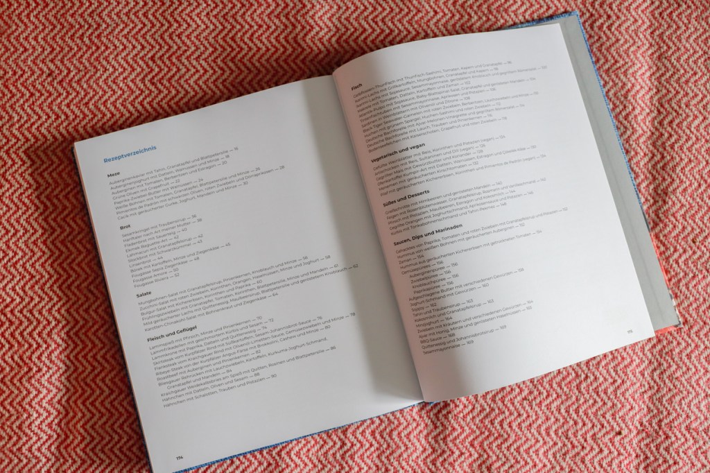 Das Buch gliedert sich in einen allgemeinen Grundlagenteil, verschiedene Kapitel zu Meze, Broten, Salaten, Fleisch und Geflügel, Fisch, vegetarischen und veganen Gerichten, Desserts und Grundrezepten für Soßen und Dips. Im Anhang findet sich zudem noch ein Gewürzglossar und ein Rezeptverzeichnis.