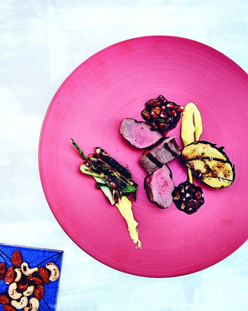 Den Rehrücken mit Lauchzwiebeln, Joghurtschmand und Kartoffeln anrichten.