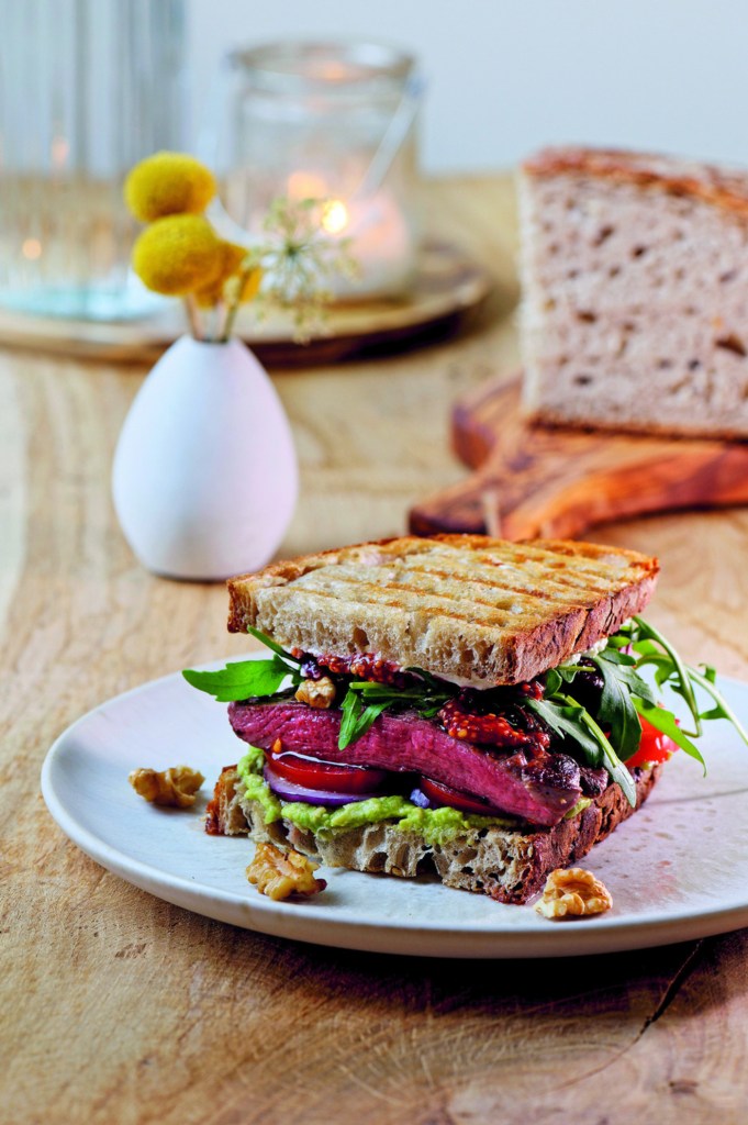 Zum Anrichten vier halbe Brotscheiben mit Frischkäse und Preiselbeersenf bestreichen. Die anderen Brotscheiben mit Avocadocreme bestreichen und mit den marinierten Zwiebeln und Tomatenscheiben belegen. Die Steaks in breite Streifen schneiden und darauf platzieren. Mit Rucola und Walnüssen toppen. Die übrigen Brothälften mit der bestrichenen Seite nach unten auflegen. Sofort servieren.