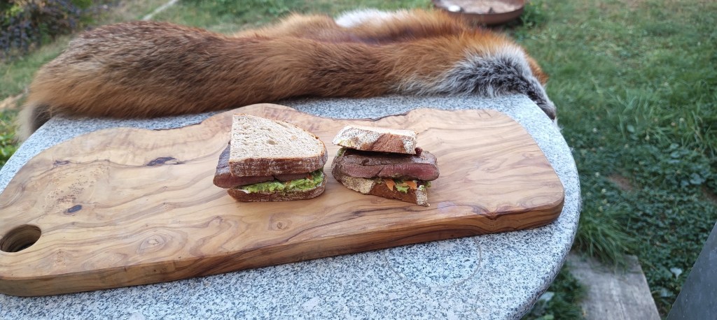Beim zweiten Rezept nach Banh-Mi-Baguettes mit Pulled Pork vom Schwarzkittel aus Einfach mal Wild erinnerte ich mich an eine Anekdote der befreundeten Weimarer Foodbloggerin Petra Hermann, die mal beim Butterbrotwettbewerb ein Butterbrot mit Rehrücken belegt hat. Folglich verwendete ich statt Steaks aus der Keule einen Rehrücken. Auch sonst hab ich mir erlaubt, persönlichen Vorlieben und der Verfügbarkeit von Zutaten geschuldet, vom Rezept abzuweichen. Ich begann damit, einen Preiselbeersenf zu mischen (um die etwas vage Angabe »körniger Senf« aus dem Rezept zu präzisieren sei hier erwähnt, dass ich als Bayer süßen Weissßwurstsenf verwendete). Die Avocadocreme hingegen bereite ich exakt nach den Angaben des Rezept zu. Da grade kein Salat im Haus war, verzichtete ich auf ihn ebenso wie auf die Zwiebel. Also blieb mir nur noch, ein paar Nusskerne zu zerkrümeln und bereitzustellen.