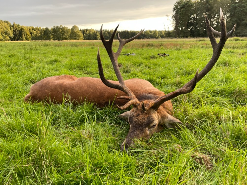 Vor mir öffnete sich eine von Wald umsäumte Wiese, die mehrere Hundert Meter in alle Richtungen maß und auf der drei große Rudel Rotwild ästen. Zwei Hirsche – beide fast ebenbürtig – röhrten nach Leibeskräften und schritten ihre Territorien ab. Ich würde gerne noch mehr erzählen. In meinem Kopf ist jede Sekunde eingraviert. Aber die Worte dafür fehlen. Es war wie eine Meditation. Nun war ich natürlich nicht zum Meditieren dort, sondern um einen Hirsch zu schießen. Daran musste mich der Förster aber erst einmal erinnern. Die Entscheidung, welcher der beiden Recken der richtige sei, war auch ihm nicht leichtgefallen. Sie fiel auf den Hirsch den ich als richtig ansprach, aber auch als schwerer zu erlegen. Zum einen befand er sich rechts von mir, zum anderen gut 170 bis 180 Meter entfernt. Genau messen konnte ich jetzt freilich nicht, das Fernglas lag ja unten. Auf meine Frage nach der Entfernung kam aber ein ähnliches Ergebnis raus, und die Auflage ließ sich auch noch einrichten und so brach der Schuss meiner Haenel sauber und klar durch den Abendhimmel. Der Hirsch zeichnete sauber, ging runter und lag. Kam hoch, erhielt noch einen Schuss und lag wieder. Ruhe. Die Anspannung fiel mir von der Schulter. Das Zittern begann. Jagdfieber. Ich hatte einen Hirsch erlegt. Einen alten Recken der ein großes Rudel beisammengehalten hatte und jetzt dort lag. Der Förster gratulierte und begann sich Gedanken um den Abtransport zu machen. Mein Einwand, ich würde den Hirsch zur Not einfach mit meinem Bergegurt ziehen, belächelte er nur. Als plötzlich der Hirsch wieder hoch ward. Ein schnell dahin geworfener Schuss von mir ging fehl. Dann noch einer, diesmal wieder mit Auflage und zumindest versuchter Ruhe. Die Kugel traf und warf ihn endgültig um. Meine Nerven waren am Ende. Zehn weitere Minuten sollten wir doch warten, war die Ansage. Ich blieb im Anschlag und beobachtete ihn mit Argusaugen. Doch das Leben war endgültig aus ihm gewichen.