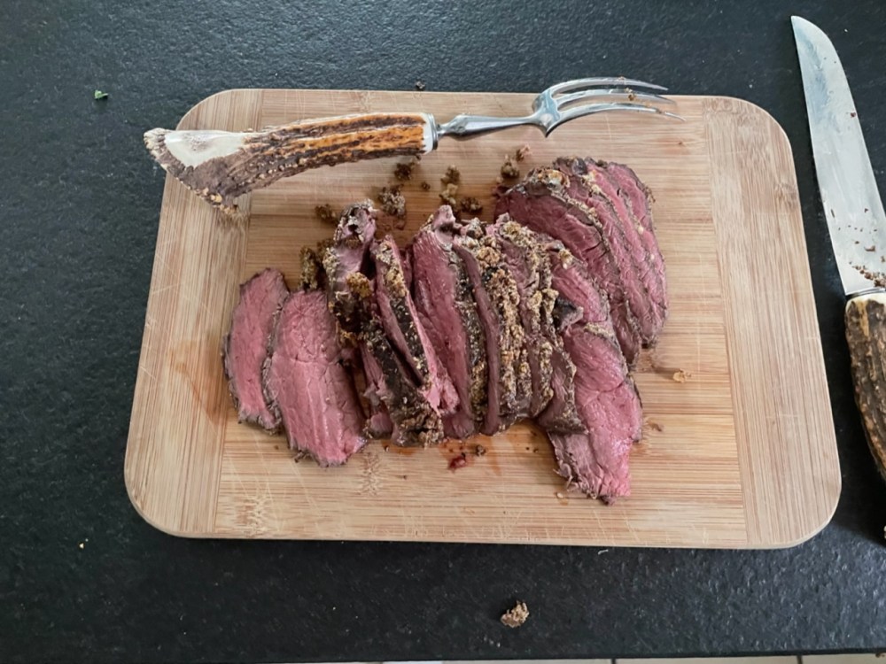Man nehme ein großes Stück Roastbeef vom Hirsch. Brate es kurz, aber scharf an und lasse es dann, bestrichen mit Pommery Senf, bei niedrigster Temperatur ca. 2 Stunden garen. Das Resultat ist ein perfektes Roastbeef, dem weder meine Frau – sonst sehr kritisch – noch mein einjähriger Sohn – ganz die Mama – und erst recht nicht die Fleischvernichtungsfraktion, bestehend aus meiner vierjährigen Tochter und mir, widerstehen konnten. Die Pfefferbeißer und das Gulasch waren ebenso gut. Der Brunfthirsch riecht extrem aber schmecken, so kann ich versichern, tut er sehr gut.