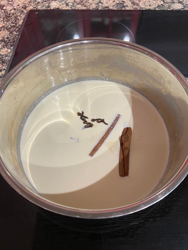 Milch und Sahne mit Vanilleschoten, Zimtstangen, Nelken bei mittlerer Hitze bis zum leichten Köcheln bringen, dabei regelmäßig rühren.