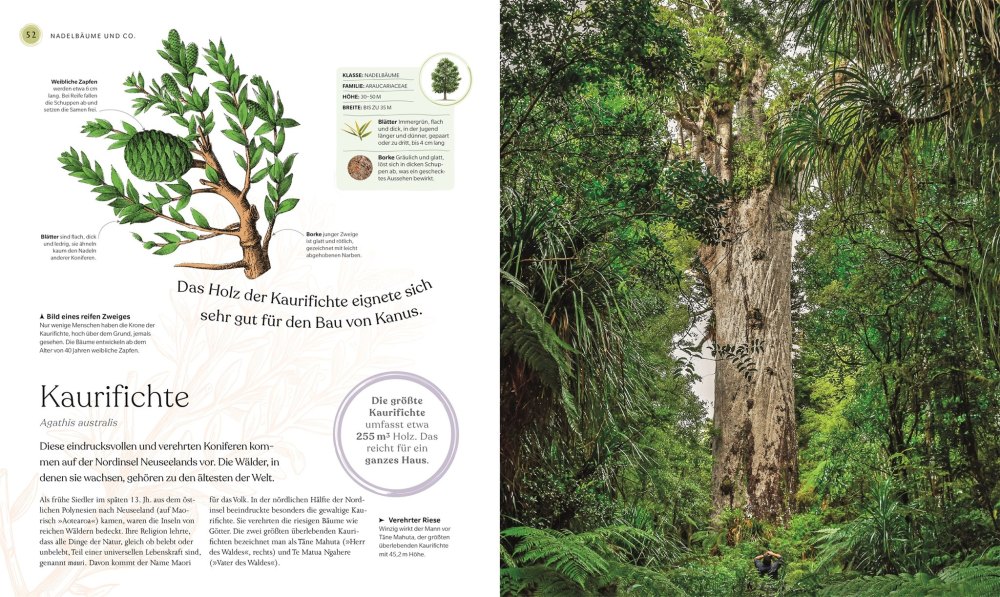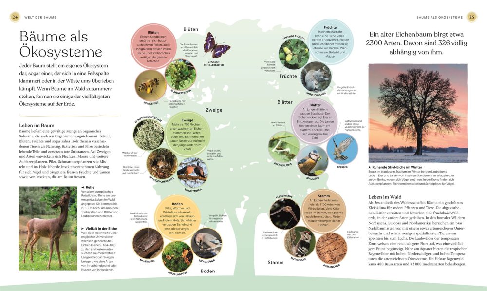 Nach einem kurzen Kapitel Welt der Bäume werden 17 Nadel- und 63 Laubbäume porträtiert, zumeist auf zwei Doppelseiten pro Baumart. Es gibt eine Vielzahl von Abbildungen – Fotos, Illustrationen, Karten und grafisch aufbereiteten Infokästen. Dem Autorenteam um den Biologen Michael Scott ist eine wahrlich beeindruckende Übersicht über die globale Vielfalt unterschiedlicher Baumarten gelungen.