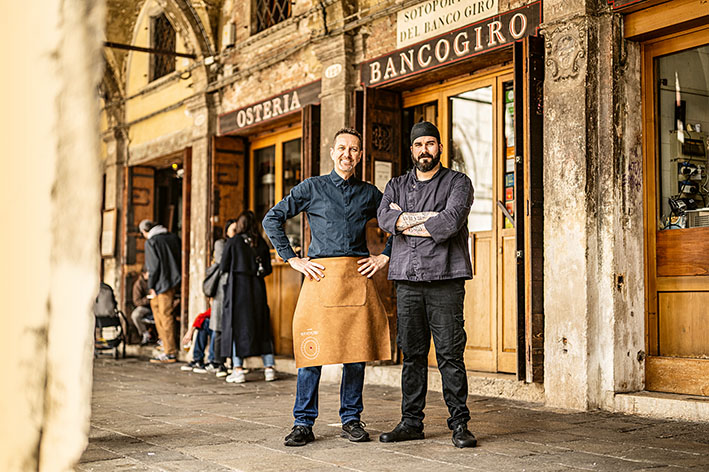 Das Erdgeschoss beherrscht eine lange Theke mit einer Riesenauswahl Cicchetti, im ersten Stock speist man vor allem im Winter im Schutz eines alten Backsteingewölbes. Die absolute Sensation ist allerdings die große Terrasse, direkt am Ufer des Canal Grande. Man hat hier richtig viel Platz, die Tische sind locker verteilt, in der Mittagssonne werden große weiße Schirme auf- gespannt. Das Gastgeber-Trio Davide, Gianluca und Mauro kümmert sich um das Wohl der Gäste. In der Küche genießen Jacopo Capponi, Jacopo Zamboni und Andrea Masutti den Heimvorteil, dass sie mit drei Schritten auf dem Rialtomarkt sind, um spontan alles, was fehlt, frisch einzukaufen. Zu früheren Zeiten tätigten die wohlhabenden Venezianer unter den Arkaden Finanzgeschäfte im Auftrag ihrer Herrschaften, beglichen Schulden, lösten Kredite ein. Heute kommen Flaneure, die einen Morgenspaziergang machen oder schon einen Einkauf auf dem Rialtomarkt hinter sich haben, gern zum Frühstück vorbei. Auf der Terrasse zu sitzen, direkt am Ufer des Canal Grande, mit Cappuccino, Cornetto und Brioche, die Gondeln, Vaporetti, Motorboote zu beobachten und die Lastkähne, die um diese Zeit auf dem Weg zu ihren Kunden sind, ist einfach unbezahlbar. Am späten Vormittag bestellt man dann köstliche Kleinigkeiten wie Melanzane con piovra lardo, Gamberetti al curry e ricotta, Cozze e Bottarga oder eine Insalata tiepi-da di polipo zu einem der vielen guten offenen Weine. Was die Hauptgerichte betrifft, so wechselt die Karte mit dem aktuellen Marktangebot. Venezianische Klassiker werden immer wieder neu interpretiert – als Jakobsmuschelstrudel, Kaninchen mit Curry, Ziegenmilch, Nelkensauce und Artischocken oder Pasta mit Marsala-Béchamelsauce, geröstetetem Schweinebauch und Erbsen. Die köstlichen Desserts wie Il Tartufo Tartufato – Bayerische Creme mit Mascarpone, Kakao, Honig und schwarzem Trüffel – sind alle hausgemacht.