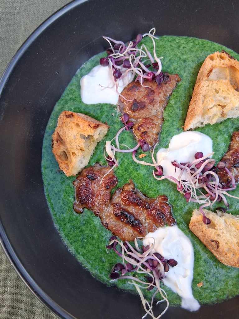 Ich bin begeistert von diesem einfachen und doch so vielschichtigen Rezept…. Die Texturen sind ein Traum: cremige Suppe, herzhafte knusprige Bratwurststücke , weicher vollmundiger Ziegenkäse und das herrlich geröstete Knoblauchbrot, welches alles zusammenhält.Unbedingt ausprobieren!