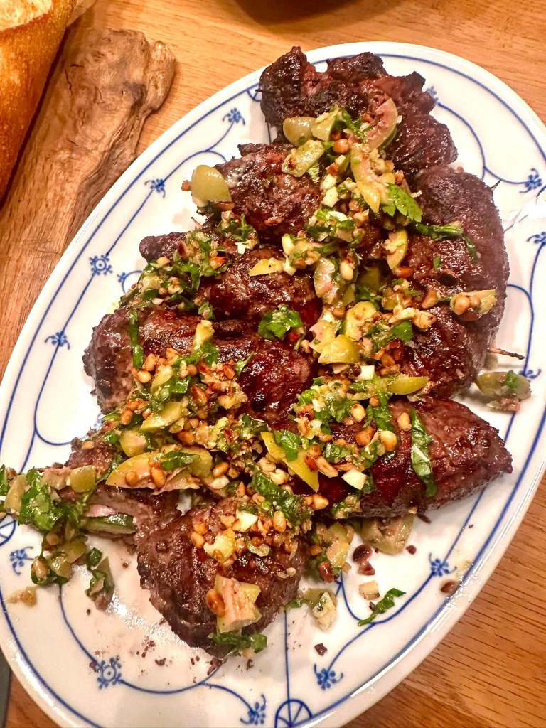 Bombette mit Pinienkern-Gremolata auf Tellern anrichten. Mit etwas Pfeffer und restlicher Zitronenschale bestreuen und servieren.