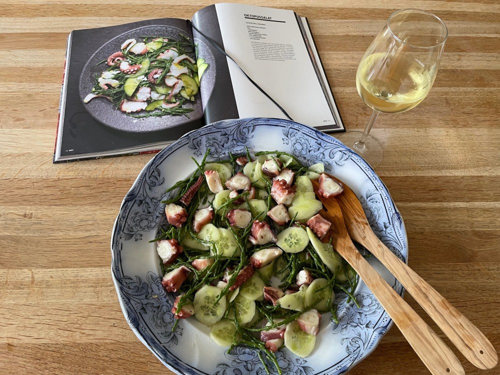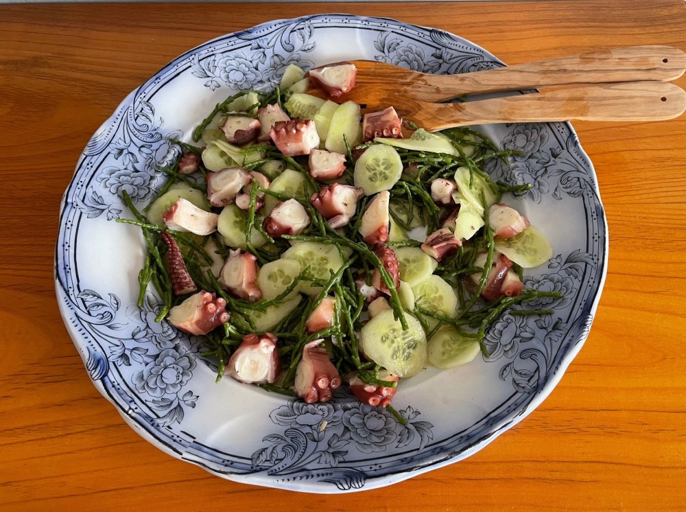 Die Oktopusarme unter kaltem Wasser abspülen. In Streifen schneiden. Gurke schälen und in dünne Scheiben schneiden. Seegras 1 Minute in kochendes Salzwasser geben, herausnehmen, abrtropfen lassen (hab ich drauf verzichtet). Alles mit den restlichen Zutaten vermischen und abschmecken.