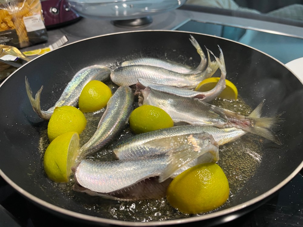 Das Schwierige beim Braten frischer Heringe ist, dass sie sich in der heißen Pfanne nach oben krümmen. Es sieht wirklich lustig aus, wenn eine Flosse nach der anderen sich langsam nach oben reckt. Wenn man versucht, die Fische einigermaßen gleichmäßig zu braten, wird das schon zu einer kleinen Herausforderung.