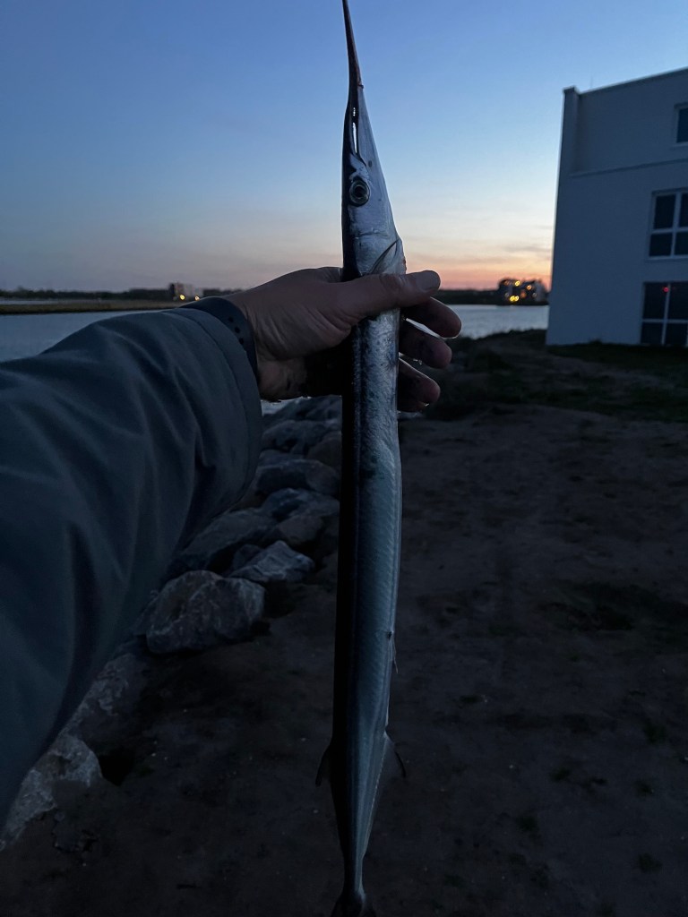 Etwa anderthalb Stunden später, mitten im angeregten Gespräch, tauchte plötzlich die Pose ab und zog zur Seite weg. Ich hieb an und kurze Zeit später hatte ich eine zappelnde Schlange mit langem, zahnbewehrtem Schnabel in der Hand – einen schönen Hornhecht. Den zweiten Zielfisch am ersten Angeltag gefangen, das lief ja prima.