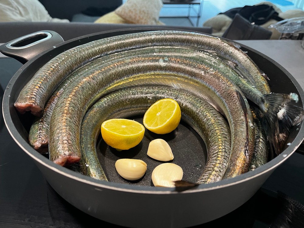 Geschuppt, ausgenommen, gewürzt und in händelbare Stücke geschnitten wanderte unser Fang in die heiße Pfanne. Wir entschieden uns für dieselbe Zubereitung wie bei den Heringen, diesmal mit ein paar Knoblauchzehen. Aus dem Bratensatz, abgelöst mit etwas Wasser, machten wir auch wieder einen Dip, wie zu den Heringen. Als Beilage gab es einen Wildkräutersalat aus dem Lebensmittelmarkt.