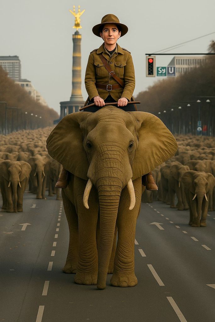 Die Story mit dem Geschenk ging um die ganze Welt. In den sozialen Medien wurde sie milliardenfach geklickt. Aber anders als im wirklichen Leben hat der botswanische Präsident im Roman seine Drohung wahrgemacht: Das schwergewichtige Geschenk ist angekommen. Schade, dass wir nicht erfahren, auf welche Weise die grauen Riesen vom Okavango an die Spree kamen. Jedenfalls treiben sie sich in Berlin rum und hinterlassen eine Schneise der Verwüstung. Im Buch hatte der Bundeskanzler zuvor mit einem Elfenbeingesetz den Import von exotischen Jagdtrophäen verboten. Und als Reaktion nun das! Es entwickelt sich eine Satire auf den Politikbetrieb in der Hauptstadt – unterhaltsam, amüsant, manchmal zynisch. Ähnlichkeiten mit lebenden Personen und realen Parteien sind nicht zufällig, sondern beabsichtig. Die Einzelheiten sollen hier nicht verraten werden. Nachdem die migrantischen Rüsseltiere nicht nur in den Obst- und Gemüseabteilungen großer Supermärkte, sondern auch im politischen Porzellanladen der Berliner Politik ausreichend Kollateralschäden verursacht haben, muss der Bundeskanzler handeln. Im Abwehrkampf gegen eine rechtspopulistische Partei kann er die Wiederwahl nur noch retten, indem er die Elefanten nach Ruanda abschiebt. Doch dort erteilt man Jagdlizenzen…