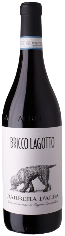 Wein und Hund: Die Verbindung des Lagotto Romagnolo mit dem Trüffelsuchen wird sogar als Etikette auf Weinflaschen genutzt, wie dem Barbera d’Alba DOC Bricco Lagotto.