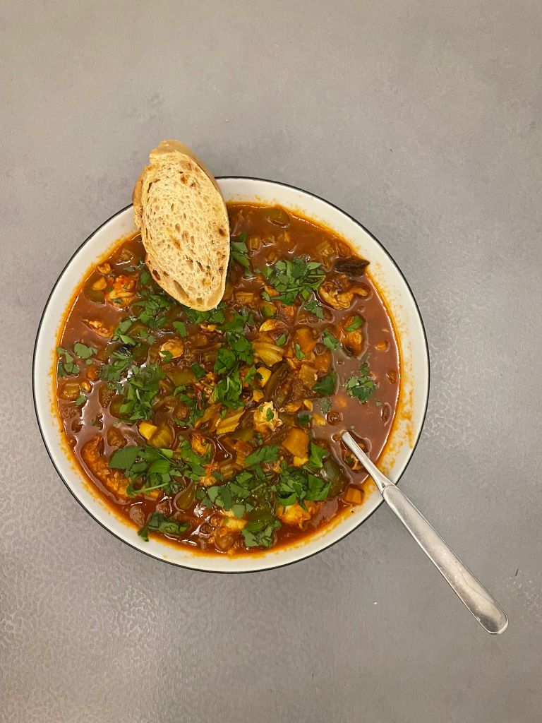 Die Cajun-Küche ist das Soulfood der lebenslustigen, einfachen Landbevölkerung. Nicht raffiniert, aber immer frisch und zumeist scharf gewürzt. Wie auch in diesem Rezept beinhaltet sie zumeist die als Heilige Dreifaltigkeit bezeichnete Kombination von grüner Paprika, Zwiebeln und Staudensellerie.