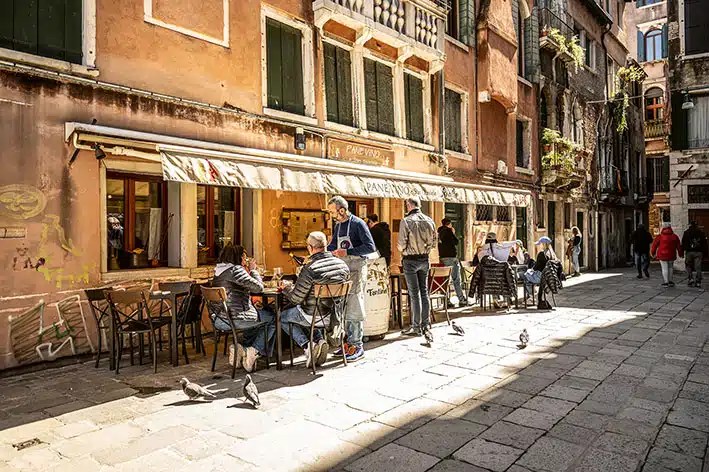 Kulinarisch galt Venedig lange als Nachzügler. Im 15. Jahrhundert klagte der Kanonikus Casola über den „vielen, aber nie schönen Fisch“, und eine Engländerin urteilte 1771 lapidar: „Die Venezianer sind miserable Köche.“ Jan Morris (* 1926; † 2020), einer der scharfsinnigsten Beobachter venezianischen Lebens, meinte Jahrhunderte später, die venezianische Küche sei „durchschnittlich“. Berühmt war Venedig eher für seine Kaffeehäuser – mehr als zweihundert soll es im 18. Jahrhundert gegeben haben, fünfunddreißig allein am Markusplatz.