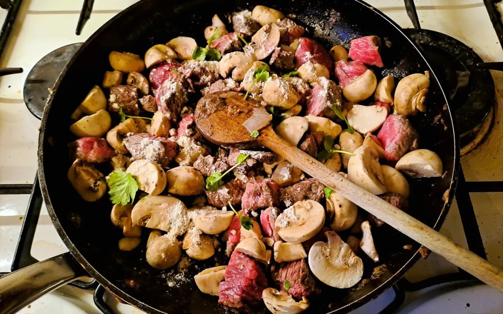 Die eintopfartige Mischung sollte dann jedenfalls eine Weile vor sich hinköcheln, damit das Fleisch wirklich gar wird und etwas aufweicht und die Sauce allmählich eindickt; Konsistenz und Geschmack sind regelmäßig nachzuprüfen (Essen nachprüfen ist ohnehin eine ausgezeichnete Freizeitbeschäftigung) und bei Bedarf zu korrigieren und mit Fleischbrühe zu verdünnen bzw. etwas zusätzlichem Mehl zu verdicken.