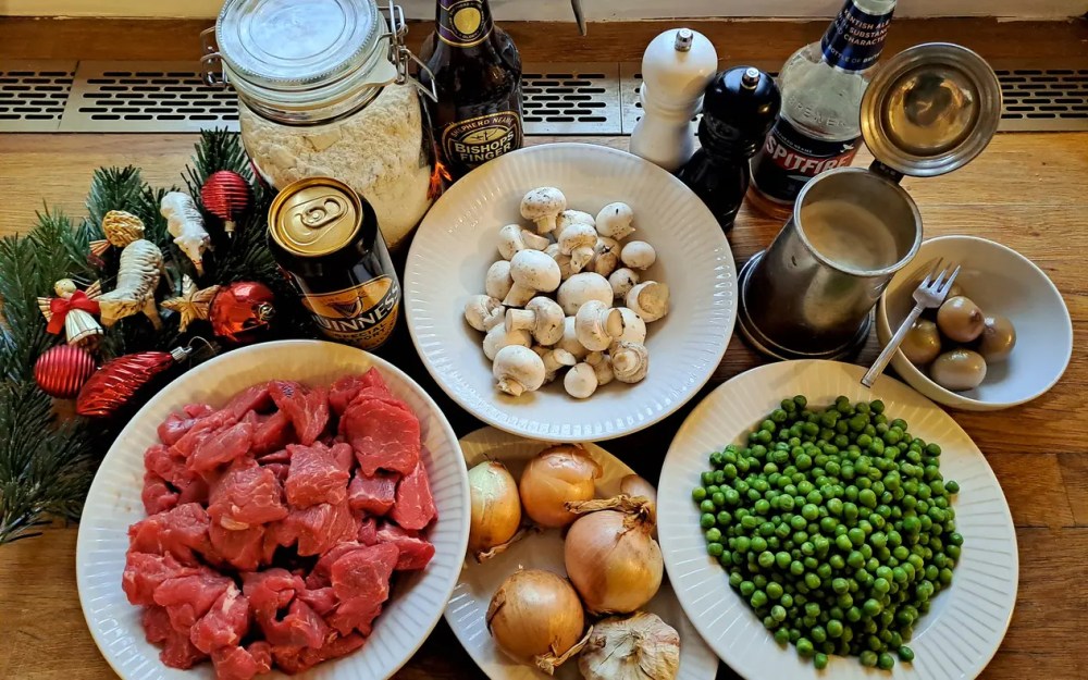 Nachdem die Fleischstücke gut angebraten sind, auch die Pilze hinzufügen und eine kleine Weile mitbraten lassen. Dann mit Bier ablöschen, etwas verrühren und den gesamten Inhalt in einen großen Kessel überführen. Die Wahl des Bieres könnte den zerbrechlichen Frieden des Inselreiches bedrohen, daher überlasse ich lieber dem Leser die Wahl, ob er ein solides, ehrliches englisches Ale wählt oder mit der Nutzung eines internationalistischen Guinness vielmehr den Nordirlandkonflikt erneut anstacheln will.