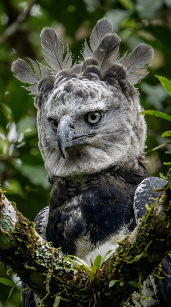 Die unheimlich Kopfbefederung der Harpyie ist die Ursache ihres exzellenten Gehörs. In eulentypischer Manier aufgestellt, dient sie als akustischer Verstärker von Schallwellen, der ihr die punktgenaue Ortung ihrer Beute ermöglicht.